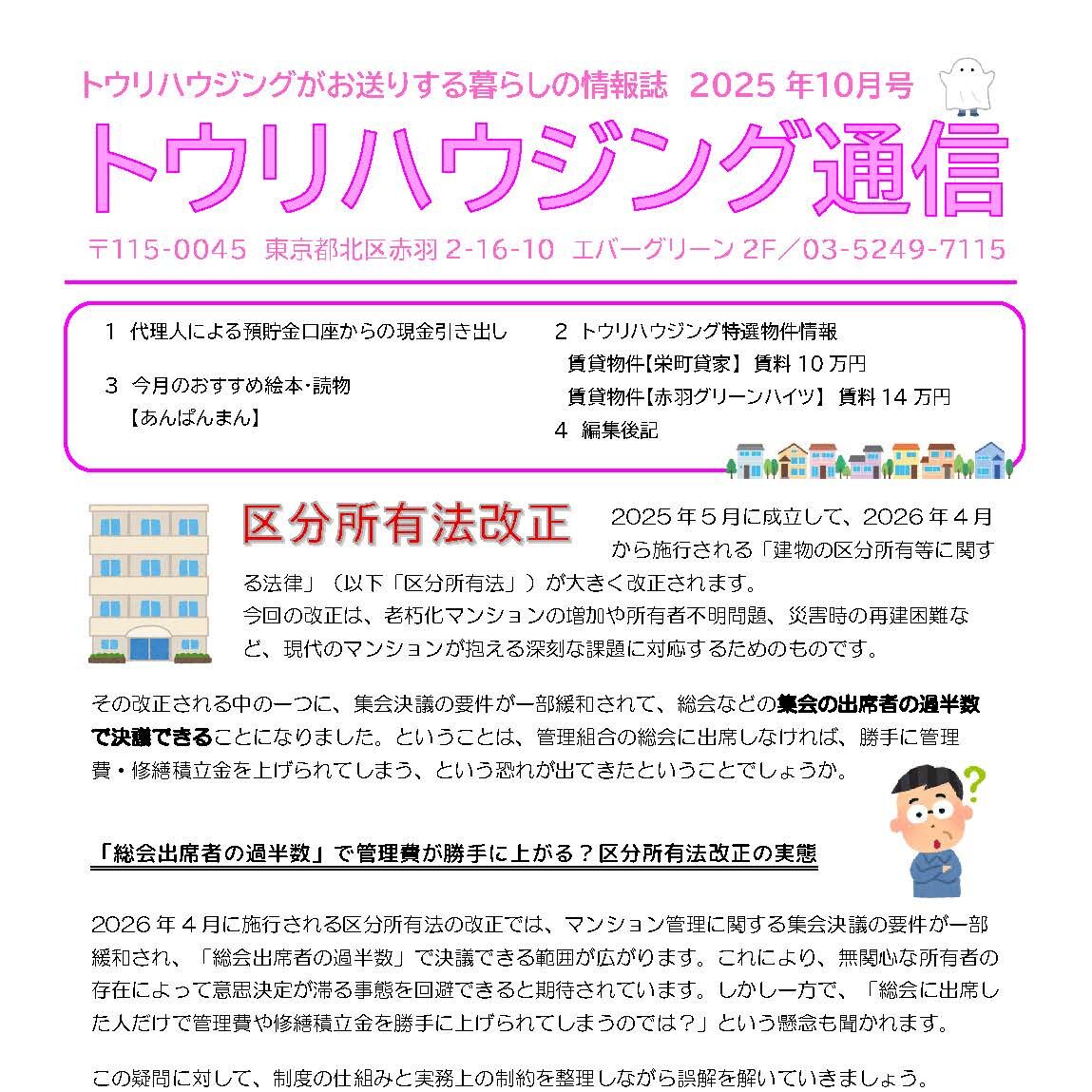 2025/10/20 トウリハウジング通信 トウリハウジング通信 2025年10月 区分所有法改正 お子様へ贈る 今月のおすすめ絵本(読物) トウリハウジング特選物件情報 編集後記 タグ: マンション | 区分所有法改正