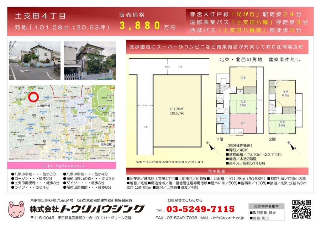 詳細は下記よりお問い合わせください。 ※お問い合わせの際は【練馬区土支田4丁目土地】とご記載下さい。